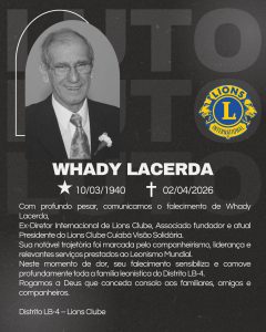 A DG PMJF Cíntia Godrim de Oliveira, Governadora do Distrito LB-4 AL 2025/2026, no uso de suas atribuições legais e regulamentares, expressa profundo sentimento de pesar pelo falecimento do companheiro Whady Lacerda, Ex-Diretor Internacional de Lions Clubes, atualmente associado fundador e presidente do Lions Clube Cuiabá Visão Solidária.