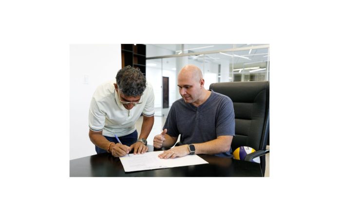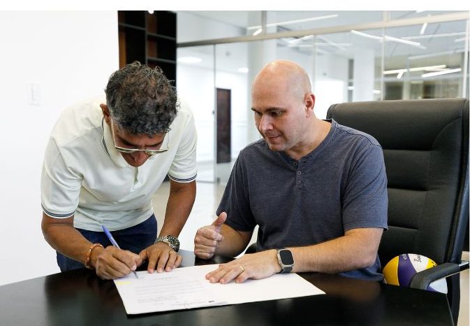 A foto ilustra o prefeito Abilio Brunini, vestido de camisa cinza, sentado numa cadeira almofada de cor preta, assinando um documento que está em cima de uma mesa. Na foto também é possível visualizar um homem de cor parda assinando um documento à caneta.