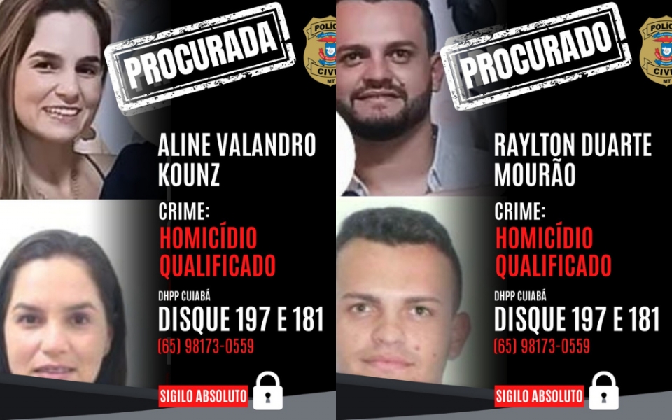 A Polícia Civil de Mato Grosso divulgou, nesta quarta-feira (17), cartazes de procurados com as fotos do policial militar Raylton Duarte Mourão e de sua companheira Aline Valandro Kouz, apontados como os principais envolvidos no assassinato da personal trainer Rozeli da Costa Nunes. O crime ocorreu na manhã da última quinta-feira (11), no bairro Canelas, em Várzea Grande.