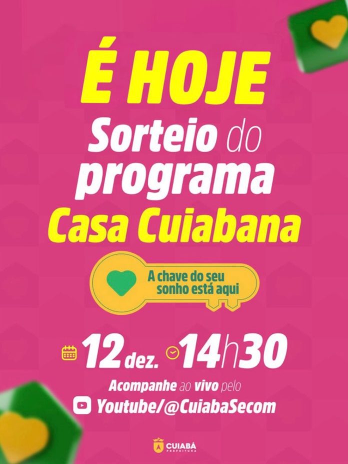 A Prefeitura de Cuiabá realizará, no dia 12 deste mês, o sorteio de unidades habitacionais que serão entregues às pessoas de baixa renda. Trata-se do programa Casa Cuiabana, conduzido pela Secretaria Municipal de Habitação.